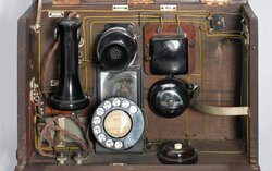 'School telephone' in polished wood case, made by the General Post Office, 1921-1940. During the first half of the twentieth century the British Post Office undertook many campaigns to promote the use of telephones. This ‘opened-out’ telephone would have been one of a pair taken round to schools to show pupils how telephones worked and to encourage familiarity in handling them. It was intended to introduce schoolchildren and others to the new automatic telephone system being introduced in the 1930s. It was entirely self contained so did not need a subscriber's line to function.