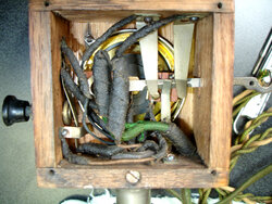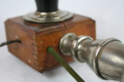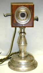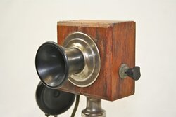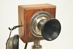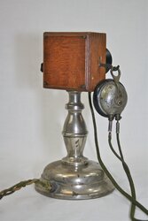 This is a very special telephone. I have no ads or catalog pictures, but all of the original parts are still on this telephone and I have no doubt that it is completely genuine. The transmitter says "The General Telephone Co., Pat'd July 6, 1897". Fantastic wooden transmitter box with a single button on the side, sitting on a nickel plated potbelly base. Complete with watchcase receiver. One of my favorite telephones and extremely rare.