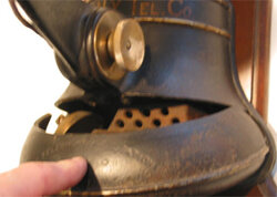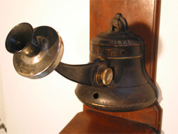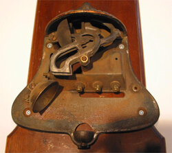 This bell-shaped coin collector is mounted on a Western Electric #85 fiddleback phone. The bell collector was only distributed through the Bell companies on WE equipment. The independents countered with a Gray specialty collector in the shape of a shield - the symbol for independents. Therefore you will find the Gray shield collector mounted on non WE wood phones. The bell-shaped collector body is cast iron and is comprised of three major assemblies. Inside there are lead chutes, one for the nickel and one for the dime. There are two gongs. The dime hits both, the nickel hits only one. Each gong had a different pitch.