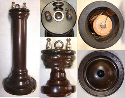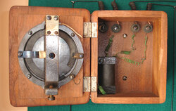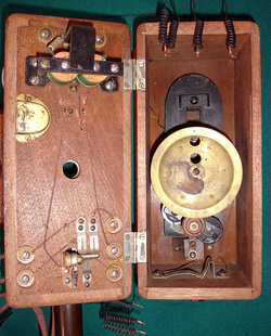 This set used the Watson polarized ringing system with the call bells and magneto crank on the outside of the box. The 1879 set was the first to use the Blake transmitter with a local wet-cell battery. The National Bell Telephone Co. only existed from March 1879 to May 1880.