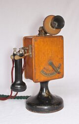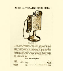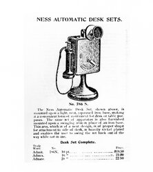 Fantastic T.W. Ness, model No. 786 N., automatic desk set mounted on a light japanned iron base, making it a convenient form of instrument for desk or table purposes. A special feature of this instrument is an automatic switch return by means of which the switch is brought back automatically to its normal point after conversation is finished. This system is particularly suitable for connecting the different departments of factories, warehouses, offices, banks colleges, etc. No central office for making different connections is required. (This description came from original marketing materials). Correct Holtzer Cabot OST receiver. Please see the picture and description of this telephone from the original late 1890s catalog.