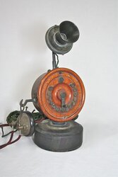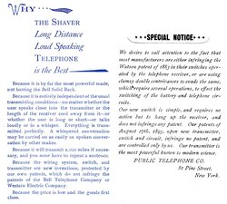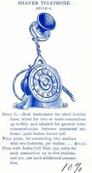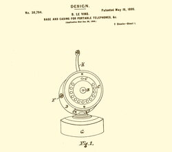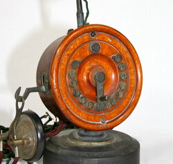 This Shaver desk set model was introduced right after the "Dolphin" base in 1899. This telephone has 12 buttons and is set up for connections with 12 other inter-office telephones. You can see from the sketches off of the scan from the original patent application how this model is different from the Dolphin base. It has a beautiful round wooden body and the early watch case receiver. The patent was issued May 16, 1899.