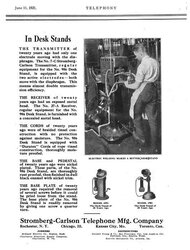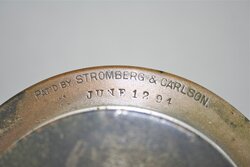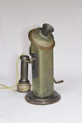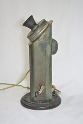 Stromberg-Carlson introduced this as their very first upright telephone in 1894. Some call it a 'coffee grinder' because of the crank on the side. It is extremely heavy, made of metal mounted on a wooden base. The metal has obviously aged a lot and turned rusty green. This also has the very earliest Stromberg-Carlson receiver. The switch hook assembly on this telephone has been reproduced after years of searching for the correct switch hook. Upon finding a Stromberg Carlson wall phone from 1894 with this exact switch hook assembly, I had it made as an exact replica. It fit the upright telephone perfectly and is believed to be the correct switch hook. This transmitter has the number 23 stamped on the faceplate so it is conceivable that this is the 23rd telephone off the manufacturing floor. This telephone is in fantastic original condition except for the reproduced switch hook. The scans are from original Stromberg-Carlson advertisements showing this as their very first telephone. Stromberg-Carlson was sold to General Dynamics in 1955 and one of the scans show this telephone in a General Dynamics publication touting this telephone as an engineering marvel in 1894.