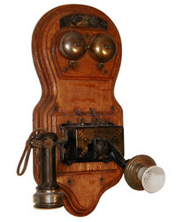 When President McKinley was shot on September 6, 1901, a Stromberg-Carlson telephone like this one was presumably used to call an ambulance. Made of oak, with a cast iron triplet and a porcelain mouthpiece.