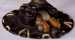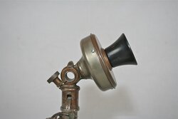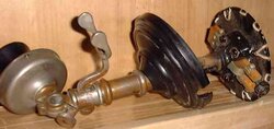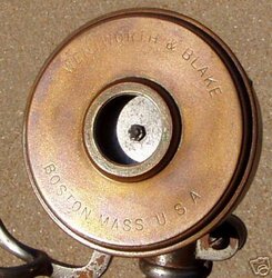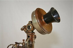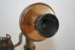 Extremely rare Wentworth & Blake straight shaft desk stand. The only documentation found so far is a listing from the Boston City Directory in 1904 of the Wentworth & Blake Telephone Manufacturing Co. at 19 High Street. Very unusual sloped switch hook and transmitter mount with a hole in it. Inside the base are components unlike any other desk set. This is a very unique telephone. Outside terminal long pole receiver. Fantastic original candlestick from 1900 - 1910.