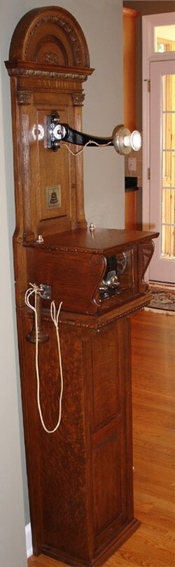 A very early Western Electric long distance wood wall phone. Early long distance phones had to be very big to hold all the batteries it would take to power a long distance conversation. Six feet tall. Circa 1890s.