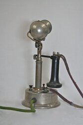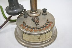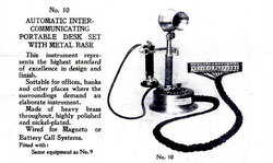 This is a Wilhelm No. 10 automatic intercommunicating portable desk set with a round cast metal base equipped for 10 station calling. It was suitable for offices, banks and other places where the surroundings demanded an elaborate instrument. The Wilhelm double diaphragm transmitter was distinctive and quite unique. 'Solid' outside terminal receiver. Faded tag on the front of base. Wilhelms are some of the most beautiful and desireable candlesticks around. One scan is a great old photograph of an office using a Wilhelm telephone and the other is taken from an original Wilhelm sales brochure.